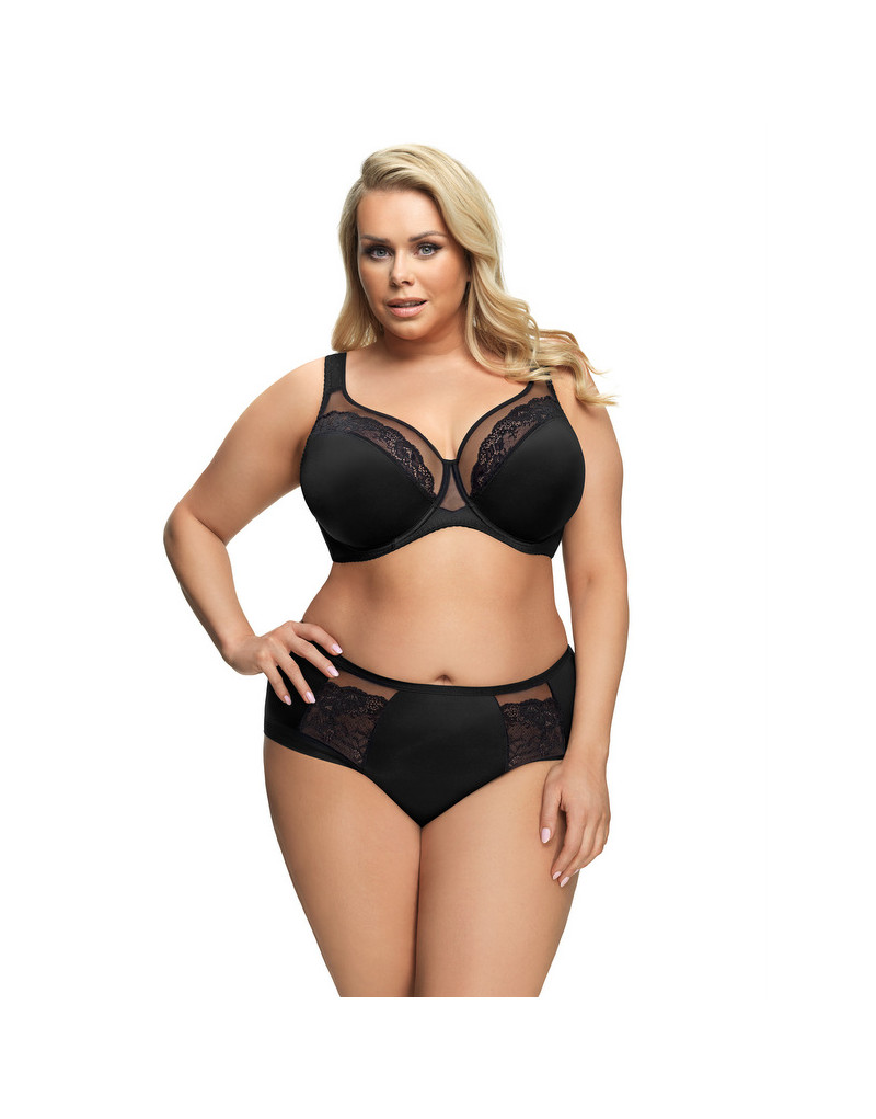 Elegancki, czarny biustonosz typu soft, z fiszbinami. Dobry na średnie i większe piersi. Bardzo ładnie zdobi dekolt, szczególnie dzięki delikatnej koronce w duecie z lekkim tiulem, które wykańczają dekolt. Ramiączka o regulowanej długości, dopasowane do rozmiaru. Skład: 90% poliamid, 7% elastan, 3% poliester.