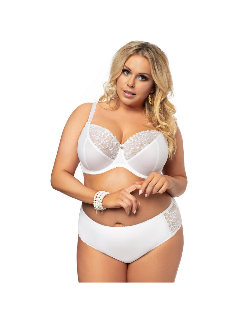 Biały biustonosz typu soft, z piękną, koronkową górą. Miseczki z fiszbinami, o profesjonalnym podkroju, bardzo dobrze zbierają i modelują piersi. Środek z gustowną przywieszką. Ramiączka o regulowanej długości. Obwód elastyczny, zapinany na haftki. Skład: 90% poliamid, 7% elastan, 3% poliester.