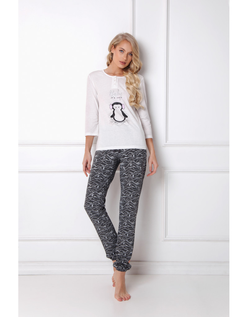 Cute pajama Arctic Peggy with a buttoned top. The 3/4 sleeves top is decorated with a fun penguin print and a "Baby it's cold" text. The pants with pockets and an elastic waistband are additionally tied with a decorative dark grey cotton string. The pants have a rubber band at the bottom.
