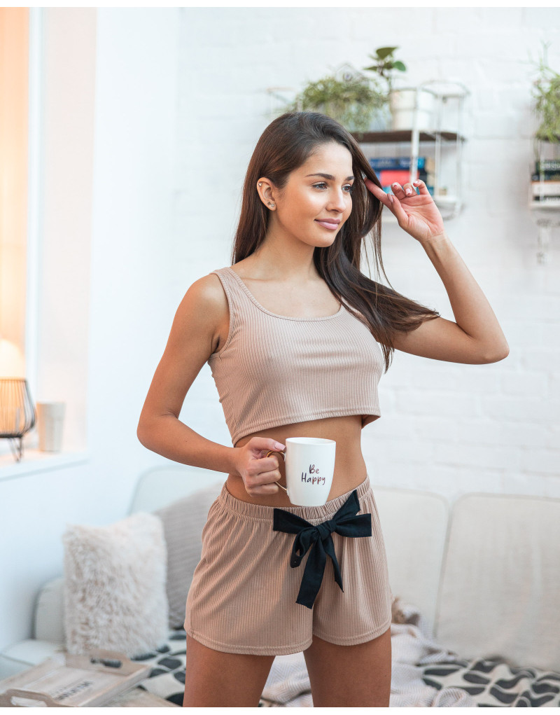 Co zarzucić na siebie gdy w mieszkaniu ciepło, a za oknem piękna pogoda? - Spójrz na zestaw Lucia, od Sensis. W zestawie sexy top na szerszych ramiączkach oraz kokieteryjne szorty na gumce z czarnym troczkiem w pasie, który zawiązać możesz na słodką kokardę. Kolor beżowy (cappucino), tkanina miękka, prążkowana, bardzo ciekawa. Skład: 62% poliester, 33% wiskoza, 5% elastan.
