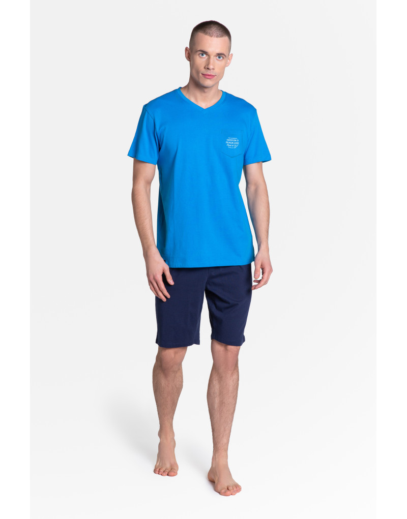Szukasz wygody w połączeniu z designem? - Dodge to dwuczęściowa piżama męska z linii Premium, marki Henderson, która powinna wpaść Ci w oko. To klasyczny, sportowy styl uzupełniony o wysokiej jakości dodatki i wykończenia. Spodnie do kolan uzupełniono efektowną gumą w pasie, z nadrukowanym logo producenta, dzięki której zyskały nowoczesnej, intrygującej formy. T-shirt bardzo komfortowy, z kieszonką. Skład: 100% bawełna.