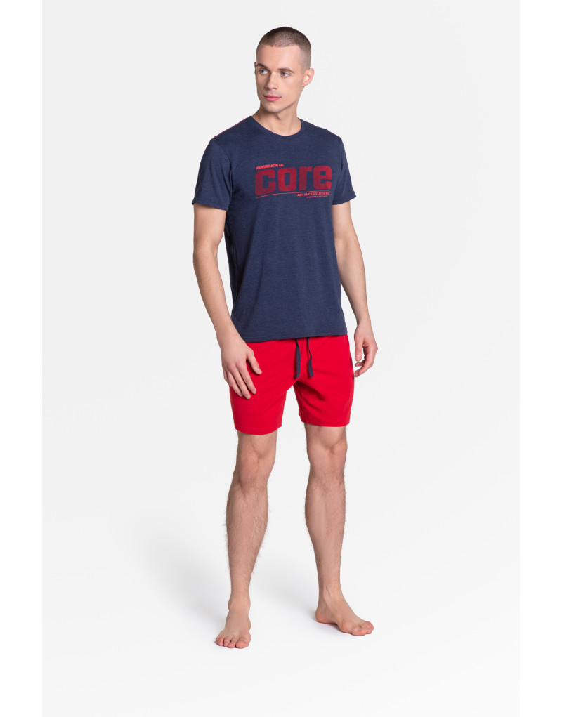 Granatowo-czerwona, męska piżama z nowej kolekcji marki Henderson. Bluzka z gumowanym nadrukiem Henderson Core, z efektem 3D (nadruk wyczuwalny w dotyku) - stylowa i zdecydowanie z charakterem, może posłużyć Ci również jako homewear. Spodnie na gumce uzupełnione troczkami do wiązania. Skład: koszulka 80% bawełna, 20% poliester, spodnie 100% bawełna.