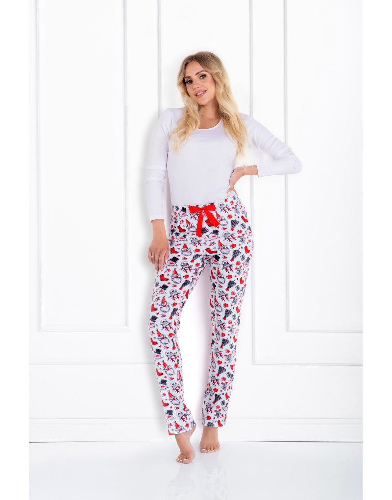 Wprowadź magię świąt do swojej sypialni z tą wyjątkową damską piżamą! Miękka, hipoalergiczna dzianina o prążkowanej strukturze zapewnia nie tylko wygodę, ale i delikatność dla skóry. Góra z dekoltem typu U i długim rękawem otula ciało, zapewniając ciepło i komfort. Spodnie o kroju slim, ozdobione świątecznym motywem, idealnie dopasowują się do sylwetki, a gumka w pasie i urocza kokardka dodają stylu i wygody.
