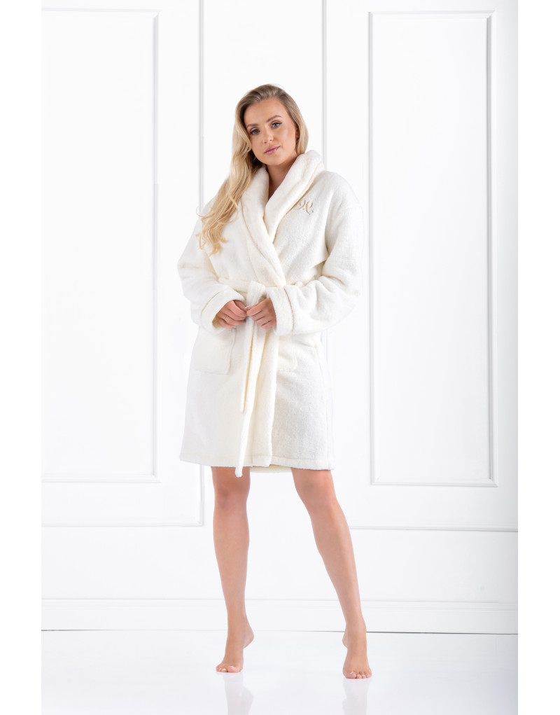 Spragniona relaksu? Załóż wieczorem ciepły, puchaty, miękki szlafrok, który otuli Twoje ciało i obdarzy wyjątkowo przyjemnym dotykiem. Szlafrok Glamour to nasza propozycja na relaks w bardzo eleganckiej oprawie. Zarówno kołnierz szlafroka jak i rękawy wykończono złotą lamówką, która nie tylko wygląda pięknie ale i przykuwa uwagę. Od razu będziesz wyglądać w nim jak Księżniczka. Szlafrok wykonano z niezwykle miękkiej dzianiny wellsoft wysokiej jakości i jest w ślicznym, jasnym kolorze ecru. W pasie wiązanie, na biodrach dwie kieszonki. Na piersi złoty haft - logo marki. Skład: 100% poliester.