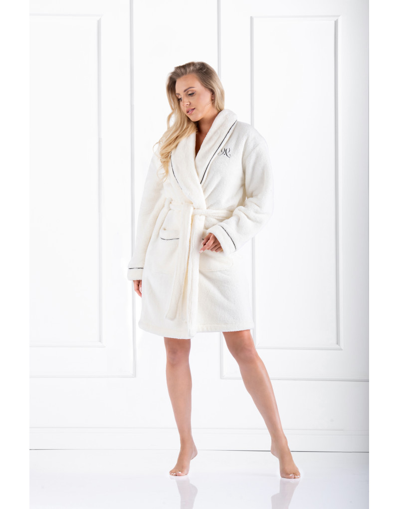 Marzysz o niezwykle mięciutkim, stylowym szlafroku? Ten szlafrok to połączenie klasycznej, ponadczasowej stylistyki z tkaniną, która rozpieści Twoją skórę. Piękny, szalowy kołnierz, mankiety rękawów oraz kieszenie ozdobiono czarną, satynową lamówką - dzięki temu szlafrok prezentuje się wykwintnie i bardzo atrakcyjnie. Na piersi czarny haft - logo marki. Tkanina typu wellsoft - wyjątkowo miękka, ciepła, puchata, wysokiej jakości. Kolor subtelny, delikatny, bardzo kobiecy. Oto szlafrok, który po prostu trzeba mieć - załóż go na siebie o poranku i perfekcyjnie zacznij swój nowy dzień! Skład: 100% poliester.