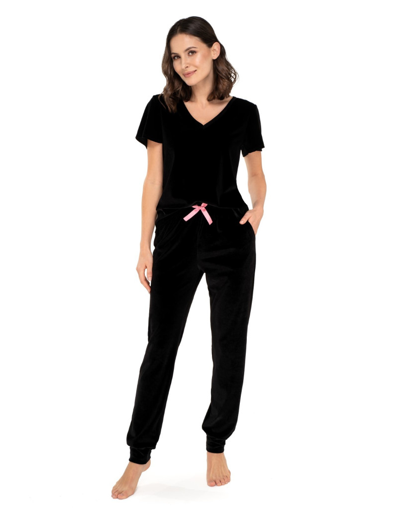 Mega modny, welurowy dres w czarnym kolorze. Idealny jako homewear, wysokiej jakości, bardzo kobiecy. Tkanina średniej grubości, sprawdzi się również pomiędzy sezonami, jest bardzo wygodna i elastyczna. Góra z krótkim rękawem i z dekoltem do szpica. Spodnie długie, luźne, wykończone ściągaczami przy kostkach. W pasie miękka gumka i kokardka. Po bokach kieszenie. Skład: 100% poliester.
