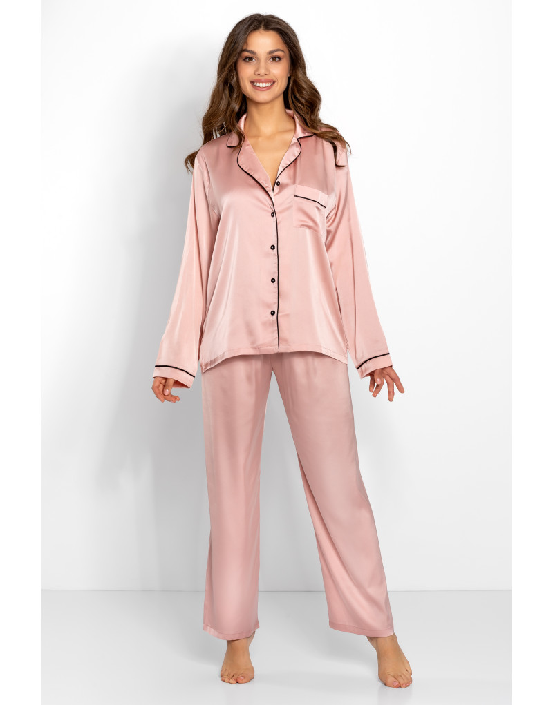 Oto piżama damska, która łączy w sobie klasyczną elegancję i komfort na wysokim poziomie! Ten dwuczęściowy zestaw wykonany z gładkiej, przyjemnej w dotyku satyny to idealny wybór zarówno na co dzień, jak i na prezent. Bluzka z długim rękawem, eleganckim kołnierzem i delikatnymi wykończeniami (piping) nadaje całości wyjątkowego charakteru. Kieszonka na wysokości piersi oraz ozdobna kokardka w pasie dodają jej uroku i kobiecego wdzięku.