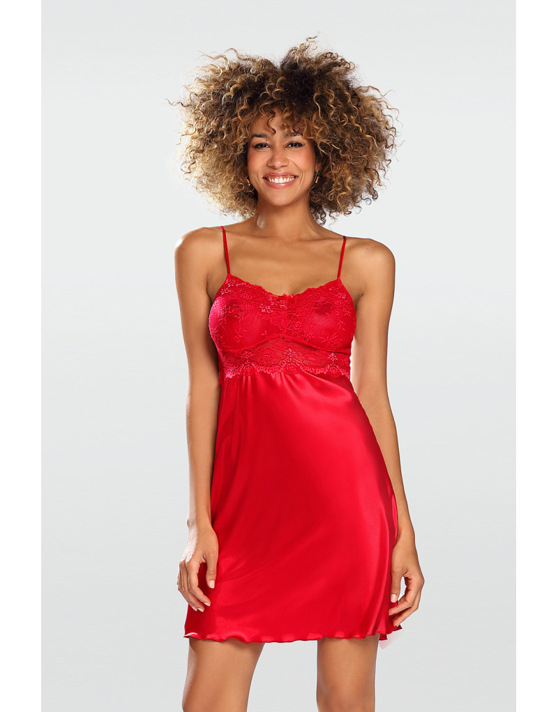 Koszulka nocna satynowa w czerwonym kolorze, idealna na prezent na Walentynki. Głęboki dekolt ozdobiony elegancką koronką. Luźny, komfortowy krój bez ramiączek. Wykonana z ekskluzywnej satyny, o przyjemnej w dotyku, miękkiej fakturze. Ramiączka regulowane. Produkt polskiej produkcji, zapakowany w eleganckie pudełko. Składa się z 100% poliesteru, co gwarantuje wysoką jakość.