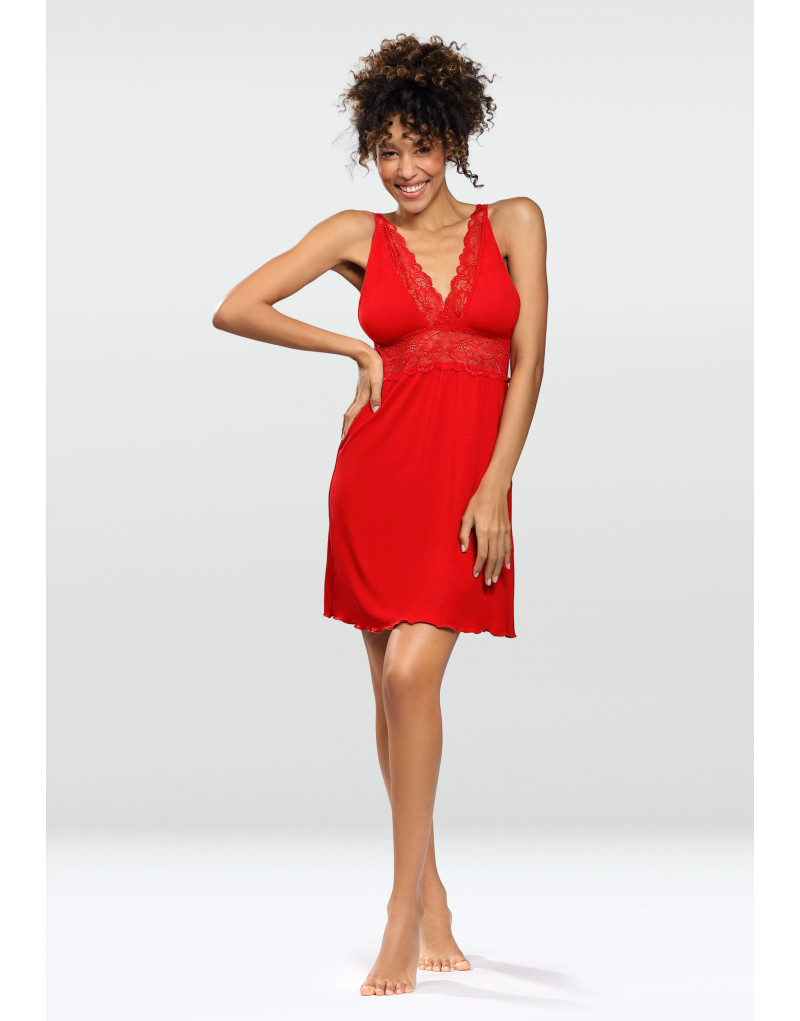 Koszulka nocna w czerwonym kolorze, idealna na prezent na Walentynki. Głęboki dekolt w szpic ozdobiony delikatną koronką. Krój, który efektownie podkreśla sylwetkę. Wykonana z elastycznej, przyjemnej w dotyku i miękkiej tkaniny. Materiał składa się z 92% wiskozy i 8% elastanu, co zapewnia wysoką jakość. Ramiączka regulowane. Produkt polskiej produkcji, zapakowany w eleganckie pudełko.