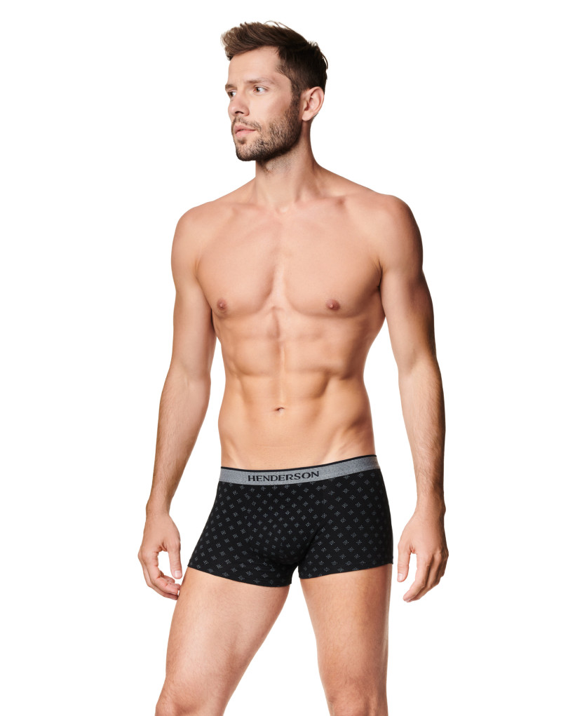 Czarne bokserki zdobione lekkim printem. W pasie srebrna, subtelnie błyszcząca guma z logo marki. Profil przedni profilowany, zapewni Ci najwyższą wygodę. Bokserki doskonale uzupełnią właściwie każdą Twoją, codzienną stylizację niosąc z sobą komfort i styl. Skład: 95% bawełna, 5% elastan.