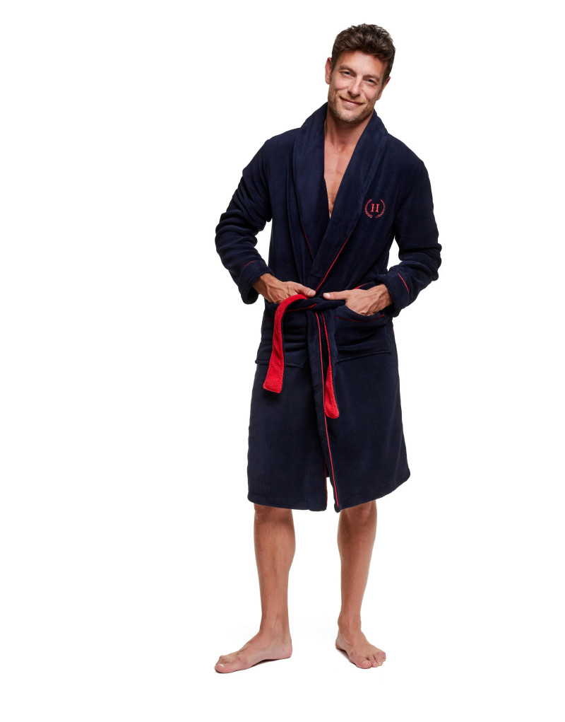Ekskluzywny szlafrok z szalowym kołnierzem, marki Henderson. Wyjątkowo miękki i prawdziwie męski. Kolor ciemnogranatowy, (typu navy), zdobiony czerwoną lamówką. Na piersi wyhaftowana litera 'H". Biodra z kieszeniami, w pasie wiązanie. Bardzo dobra jakość. Idealna propozycja także na prezent. Skład: 100% poliester.