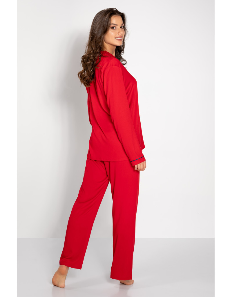 Odkryj świąteczną elegancję i komfort w jednym, dzięki naszej wyjątkowej piżamie! Bluzka z długim rękawem, wykończona eleganckim pipingiem i klasycznym dekoltem typu V, dodaje piżamie szyku, a jednocześnie zapewnia pełen komfort. Gładka, miękka tkanina z 100% wiskozy nie tylko delikatnie otula ciało, ale również pozwala skórze oddychać, co sprawia, że piżama idealnie sprawdzi się w długie zimowe wieczory.