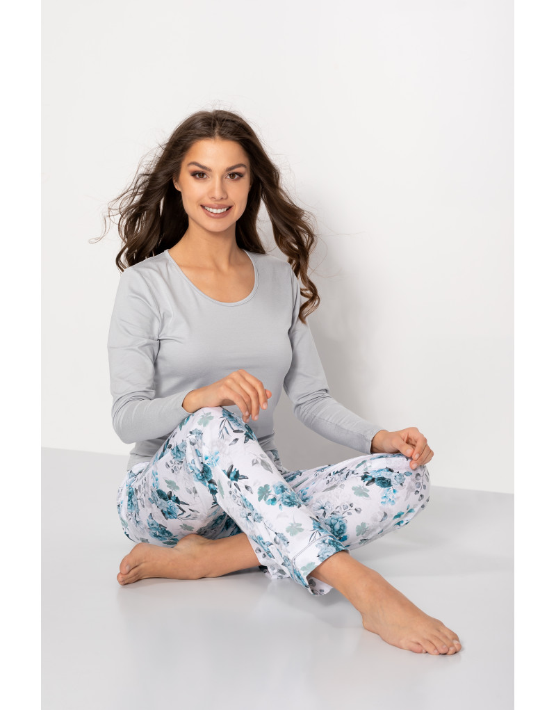 Przedstawiamy piżamę, która łączy w sobie kobiecy styl i komfort! Komplet damski dwuczęściowy, zaprojektowany i uszyty w Polsce, wykonany jest z naturalnych materiałów, dzięki czemu zapewnia delikatność i przewiewność przez całą noc. Bluzka z długim rękawem i dekoltem typu U, wykończonym elegancką lamówką doskonale układa się na sylwetce, a jej delikatna kolorystyka dodaje subtelności.
