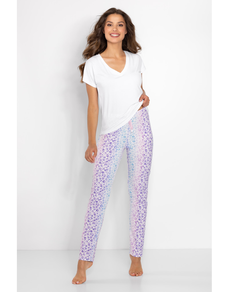 Odkryj kobiecy styl i niepowtarzalny komfort z piżamą Coco, w eleganckim połączeniu koloru białego i liliowego. Na ten stylowy design składają się bluzka z krótkim rękawem i długie spodnie w delikatnej kolorystyce. Elegancki dekolt typu V podkreśla kobiecość i dodaje szyku. Komfortowe spodnie z gumką w pasie, nie posiadają kieszeni. Piżama damska wykonana z miękkiej dzianiny "Peach Effect", dzięki czemu jest wyjątkowo przyjemna w dotyku. Wysoka jakość zadruku gwarantuje trwałe i piękne kolory. Wybierz piżamę Coco i poczuj się wyjątkowo każdej nocy, otulona miękkością i stylem.