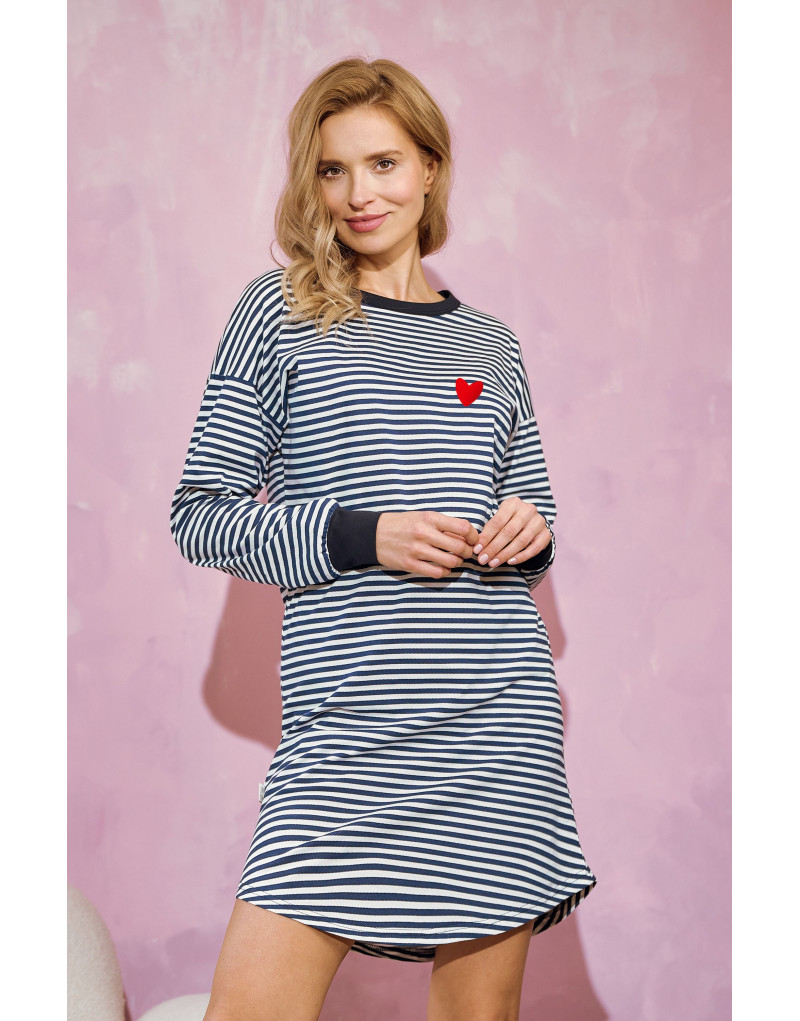 Wprowadź do swojej nocnej garderoby odrobinę marynarskiego stylu z koszulką nocną w biało-granatowe paski! Wykonana w 100% z miękkiej i oddychającej bawełny, zapewnia komfort na wysokim poziomie. Luźny krój i półokrągły dekolt gwarantują swobodę ruchów, a długość przed kolano i półkolisty dół dodają jej dziewczęcego wdzięku. Uroczy nadruk serduszka na piersi to subtelny akcent, który przyciąga uwagę. Długie rękawy zakończone mankietami zapewnią ciepło w chłodniejsze wieczory. Koszulka nocna w marynarskie paski jest idealna na każdą porę roku – zarówno na leniwe poranki, jak i spokojne wieczory!