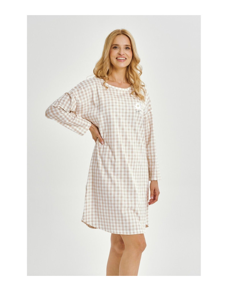 Postaw na nocną elegancję w naturalnym wydaniu! Ta pastelowa koszula nocna w biało-beżową kratkę z delikatnym, kwiatowym motywem to połączenie kobiecego uroku i codziennej wygody. Wykonana w 100% z miękkiej, przewiewnej bawełny, zapewnia skórze przyjemny dotyk i komfort przez całą noc. Luźny krój i długość przed kolano gwarantują swobodę ruchów, a półkolisty dół dodaje lekkości i subtelnego wdzięku. Długi rękaw i okrągły dekolt sprawiają, że model ten jest idealny na chłodniejsze wieczory i spokojne poranki. Stylowa, wygodna i ponadczasowa – doskonały wybór dla kobiet ceniących komfort w pięknym wydaniu.