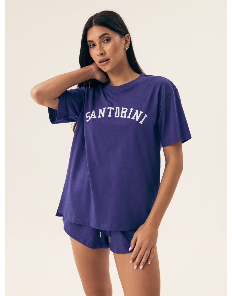Bluzka z krótkim rękawem, półokrągłym dekoltem i nadrukiem „Santorini” przyciąga wzrok i wprowadza w wakacyjny nastrój. Krótkie spodenki z szeroką gumą w pasie i troczkami zapewniają swobodę i wygodę nawet w najbardziej spokojne poranki. Luźny krój i bawełniana tkanina sprawiają, że piżama jest miękka, przewiewna i idealna na każdą porę roku.