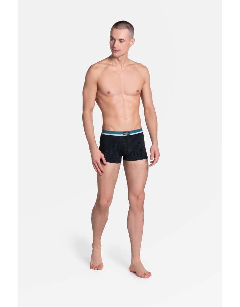 Ciemne bokserki męskie zdobione delikatnym nadrukiem na tkaninie, z ciekawą gumą w pasie w wydaniu duo-kolor. Szukasz czegoś modnego i wygodnego? - ta propozycja będzie idealna. Linia Henderson Premium. Skład: 95% bawełna, 5% elastan.