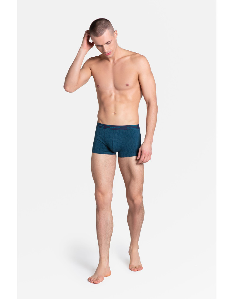 Wygodne, męskie bokserki uszyte z ciemniejszej, miękkiej, wysoce komfortowej dzianiny bawełnianej. Linia Premium marki Henderson. Propozycja, która nawiązuje do najświeższych trendów bieliźnianej mody - subtelny, mozaikowy wzór w połączeniu z niebanalną kolorystyką. W pasie guma z nadrukiem. Skład: 95% bawełna, 5% elastan.