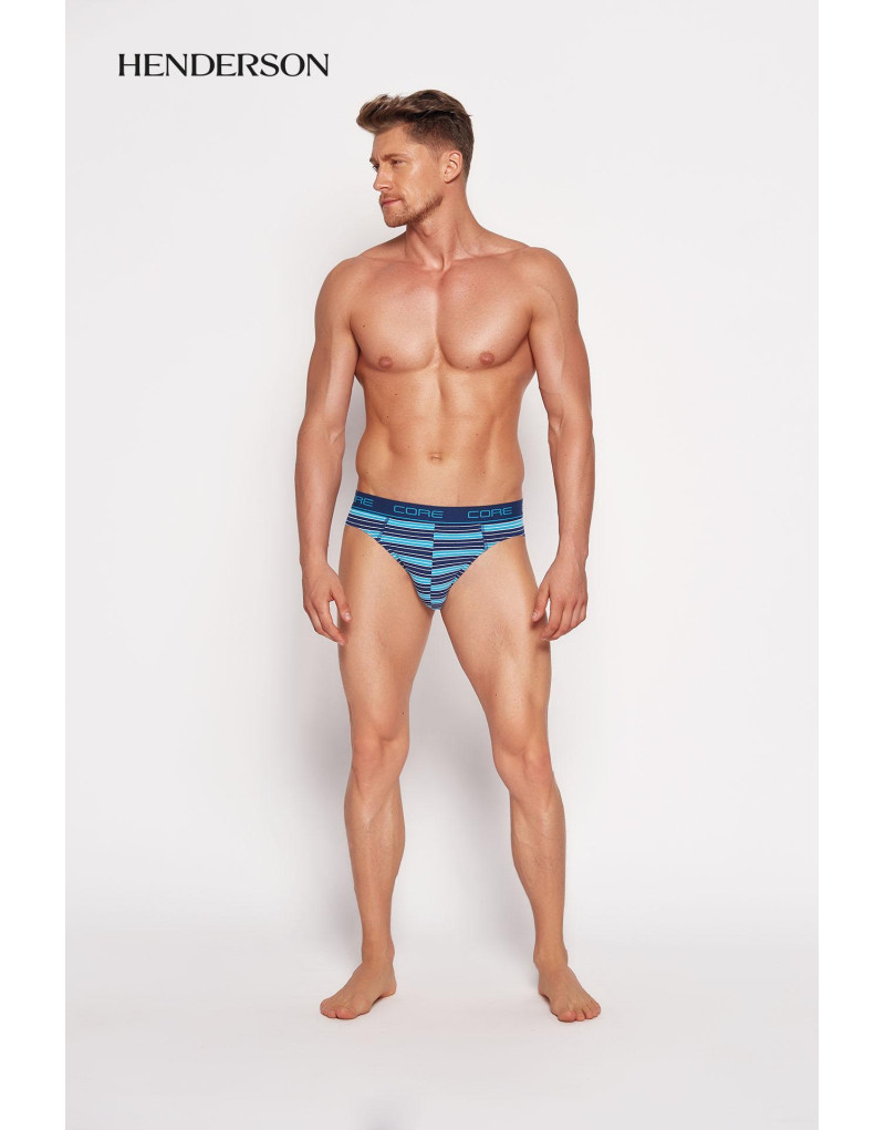 Komplet dwóch sztuk slipek męskich, z wyrazistą, nadrukowaną logo producenta, gumą w pasie. Jedne gładkie, niebieskie, drugie niebiesko-granatowe w paski. Panel stref intymnych profilowany, zadba o Twój komfort. Skład: 95% bawełna, 5% elastan.